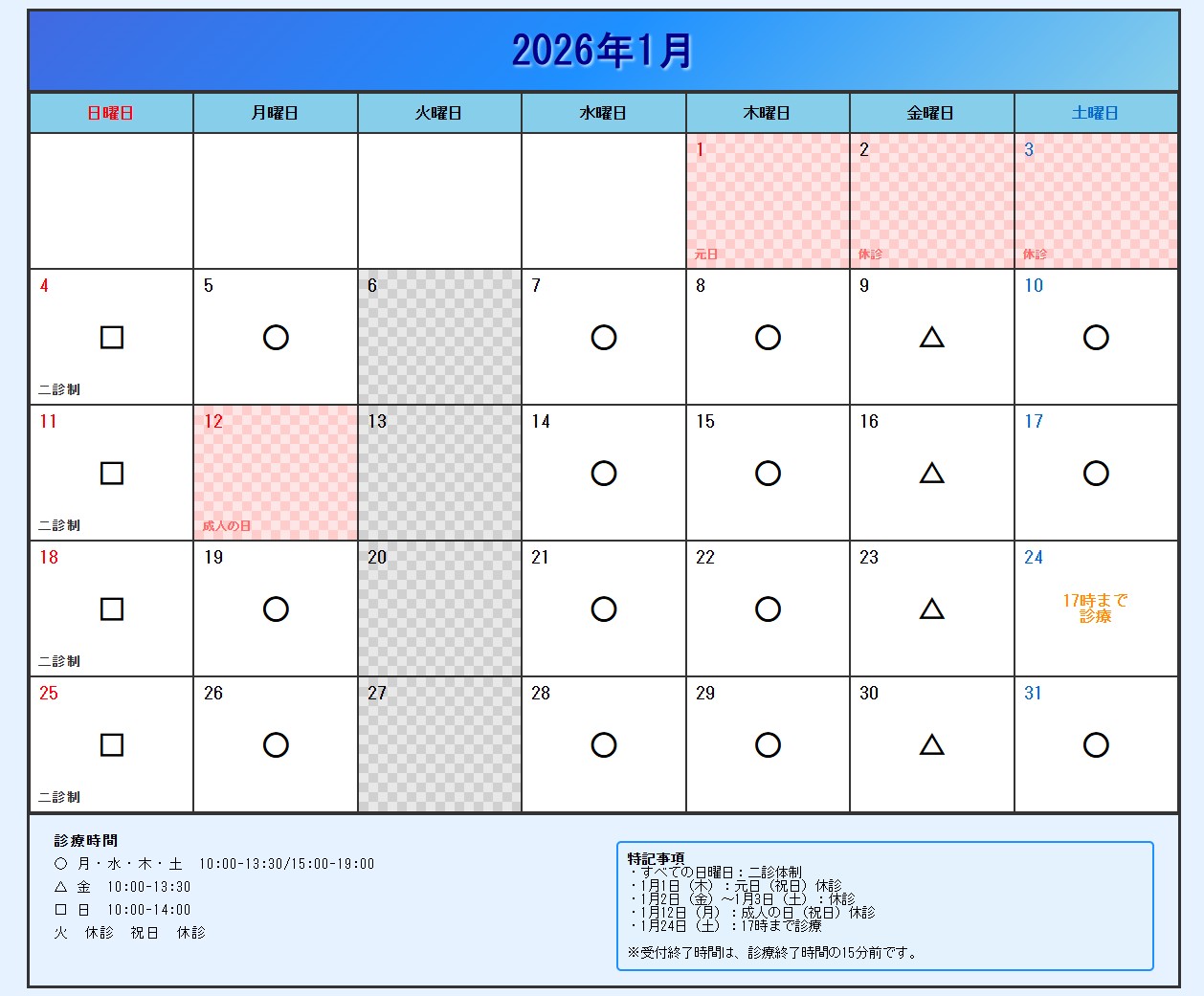 ※1月24日(土)は夜間休日診療所での当番のため、17時までの診療となります。