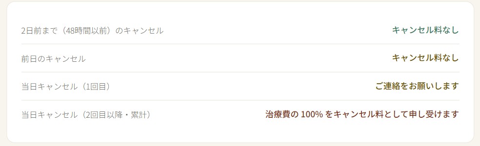 当日キャンセルが累計2回以上発生した場合、次回以降のご予約にキャンセル料が適用されます。ご了承ください。