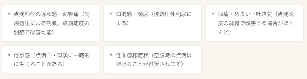 高濃度ビタミンC点滴は一般的に安全性が高い治療法ですが、すべての医療行為と同様に、副作用やリスクが生じる可能性があります。