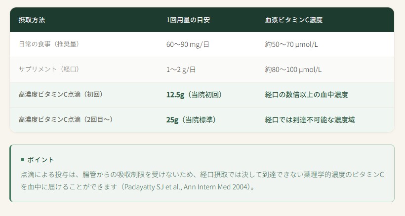 通常の食事から摂取できるビタミンCの量は1日60〜90mg程度です。高濃度ビタミンC点滴では、1回の点滴で12.5g〜50g以上を静脈内に直接投与します。これは食事摂取量の約100〜500倍以上にあたります。