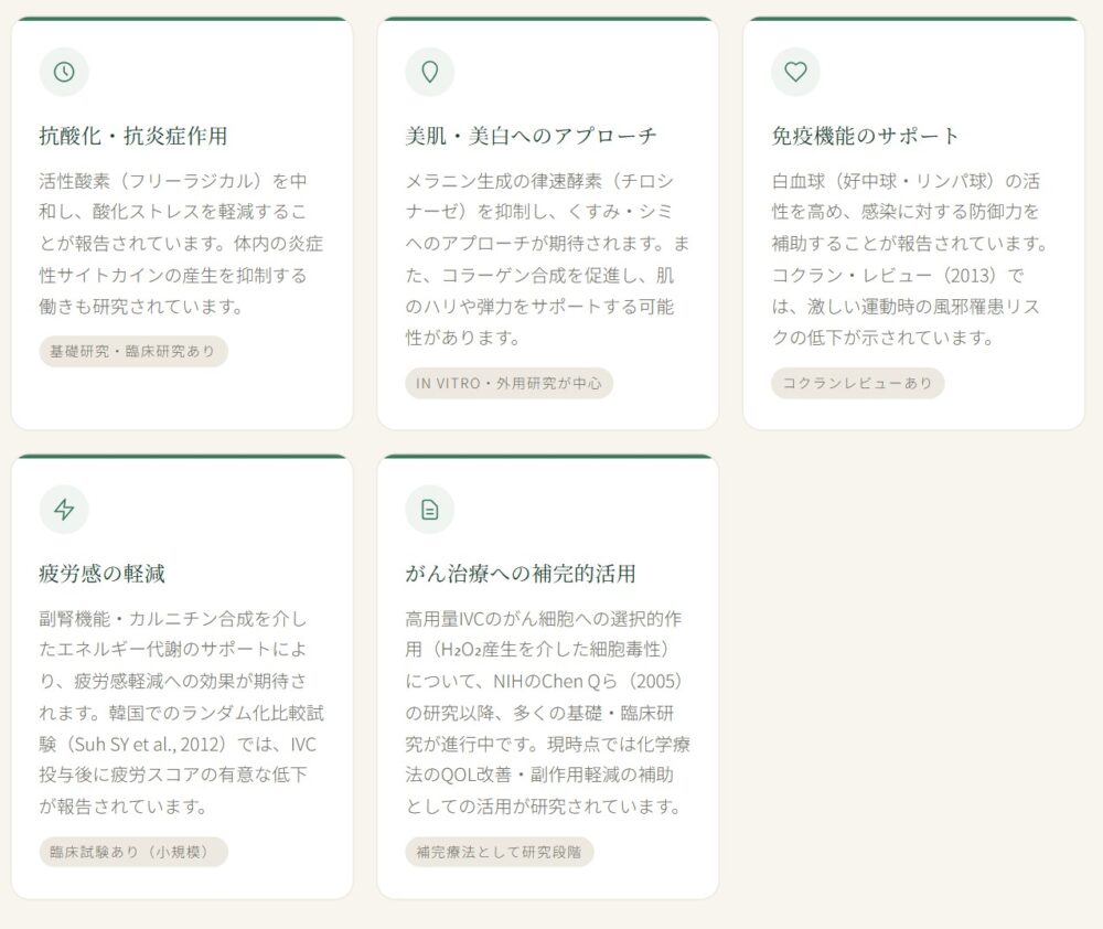 ビタミンCは強力な水溶性抗酸化物質として、フリーラジカルを直接消去します。好中球・リンパ球などの免疫細胞は血漿の10〜80倍もの濃度でビタミンCを細胞内に蓄積しており、感染防御・免疫応答の制御にビタミンCが重要な役割を果たすことが研究で示されています。